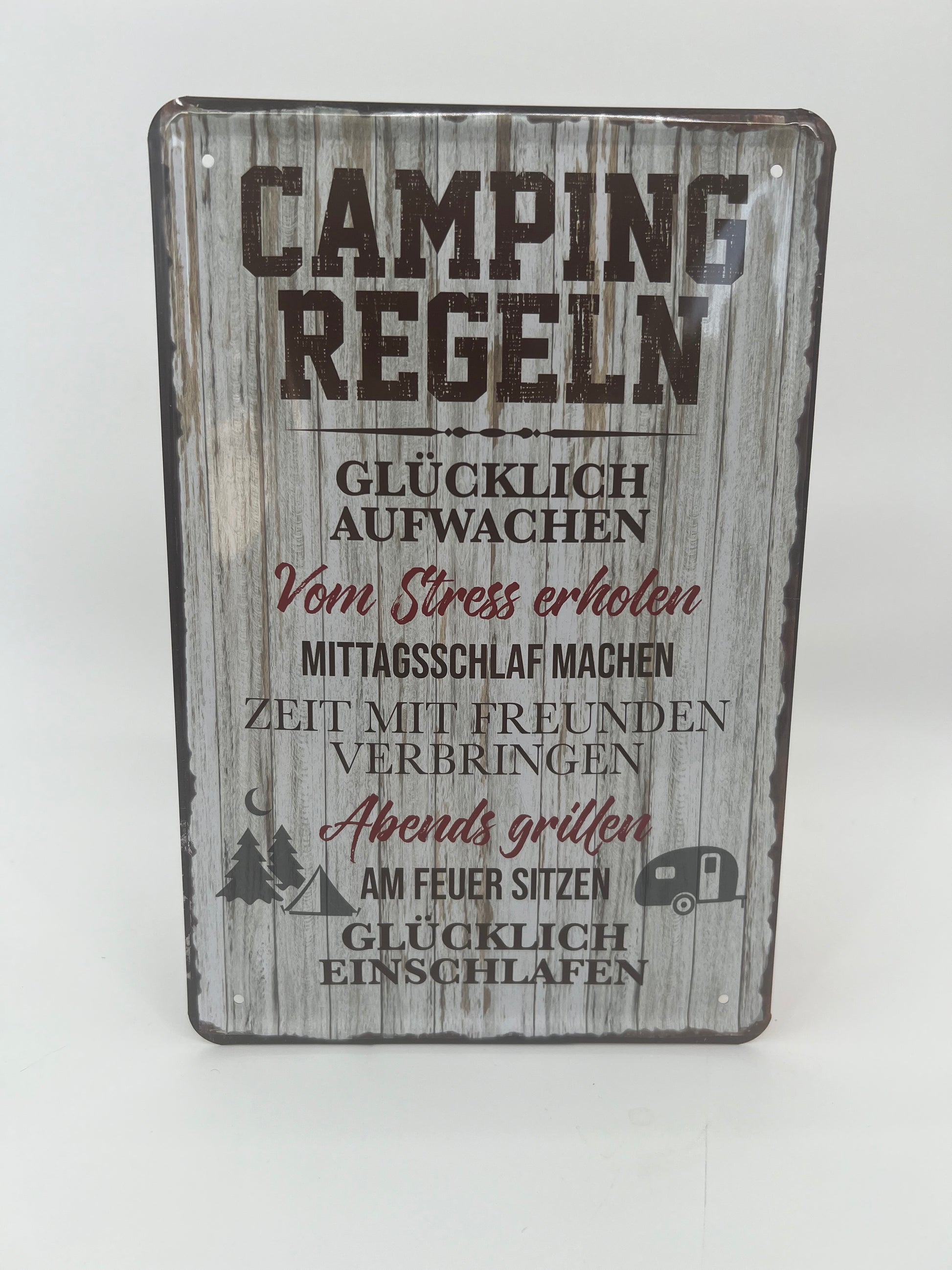 Dieses schöne Blechschild "Camping Regeln" sorgt für ein fröhliches Ambiente und schafft auf einfache Weise eine angenehme Atmosphäre. Ein tolles Geschenk für jeden Anlass!