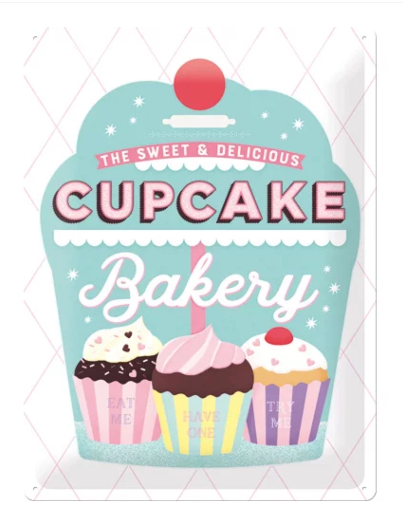 Verschenke oder behalte das nostalgische Blechschild "Cupcake Bakery"! Es ist das perfekte Geschenk für alle Bäcker und Hobbybäcker, und bringt ein schönes Vintage-Design in Deine Küche oder Geschäft!