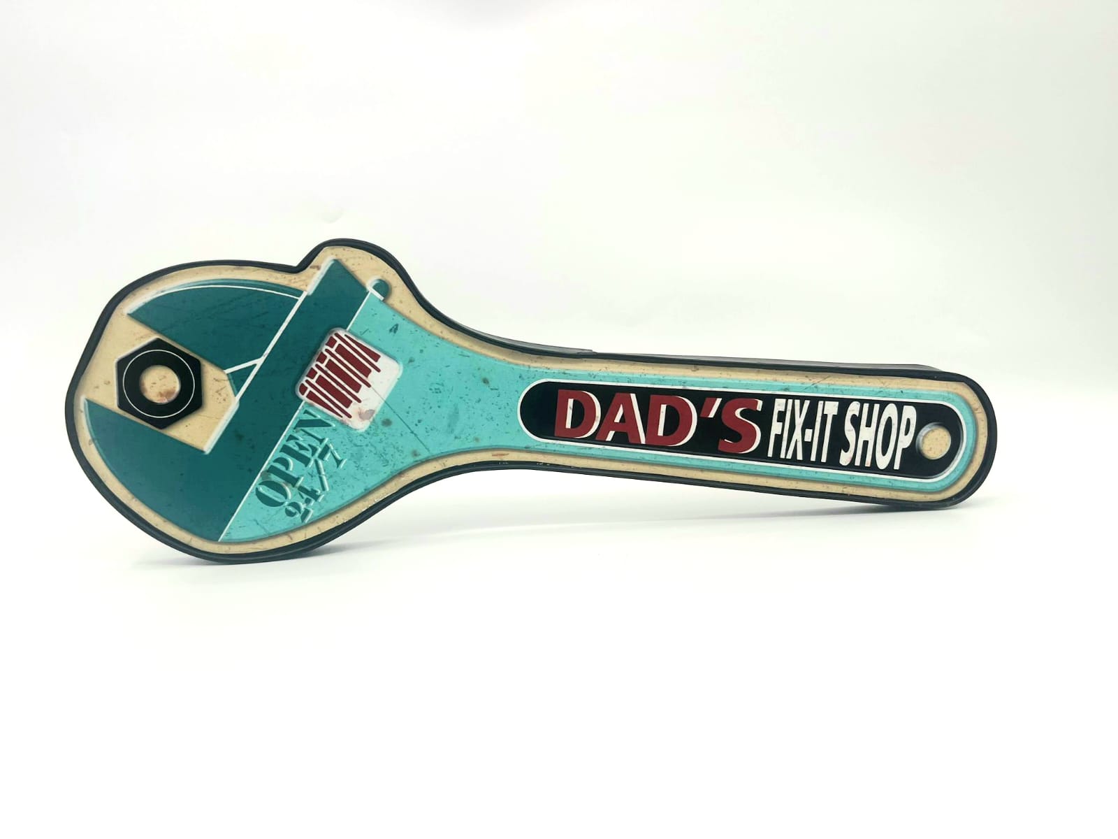 Das Blechschild "DADs Fix-it Shop" ist ein Hingucker in jeder Werkstatt.