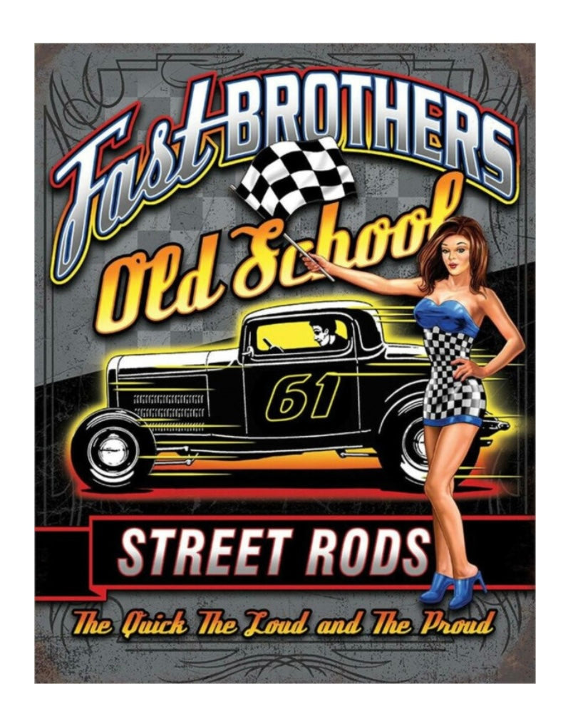 Exklusives Blechschild der 'Fast BROTHERS Old School Street Rods' - ein Muss für jeden Hot-Rod-Fan. Klassischer Pin-Up-Optik und dekorativem Design, macht dieses Schild als Geschenk zu einem Highlight.