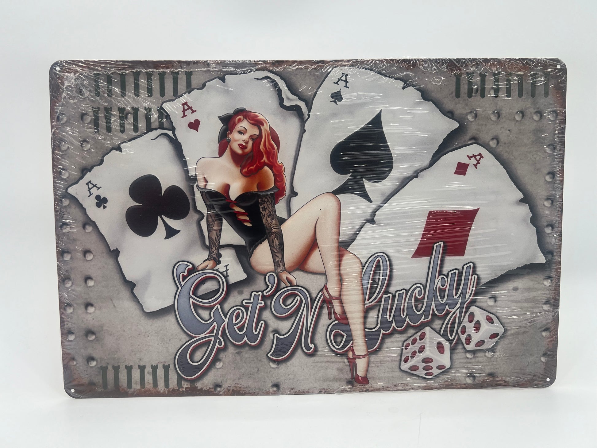 Dieses schöne Blechschild "Get'n Lucky" sorgt für ein fröhliches Ambiente und schafft auf einfache Weise eine angenehme