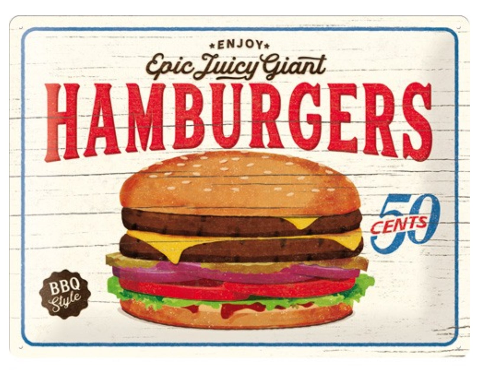 Freuen Sie sich auf unser Blechschild "Hamburger"! Dieses funkelnde Schild ist ein schöner und lebendiger Kunstwerk mit einem einzigartigen Design. Überraschen Sie Ihre Gäste mit diesem Gegenstand, der Ihr Zuhause beleben und verschönern wird!