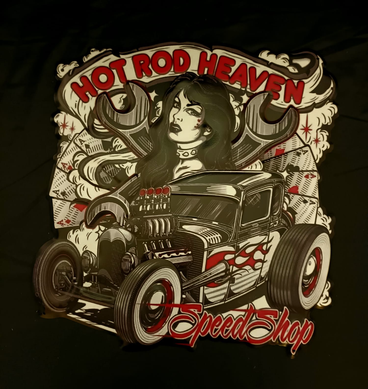 Genieße dieses Blechschild "Hot Rod Heaven". Dieses einzigartige Design wird jeden Raum verzieren und jedem ein Lächeln ins Gesicht zaubern. Ein Muss für Hot Rod-Enthusiasten!